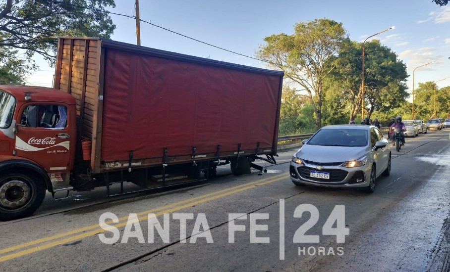 Un camión que se utiliza para el traslado de bebidas gaseosas perdió dos de sus ruedas traseras en la salida