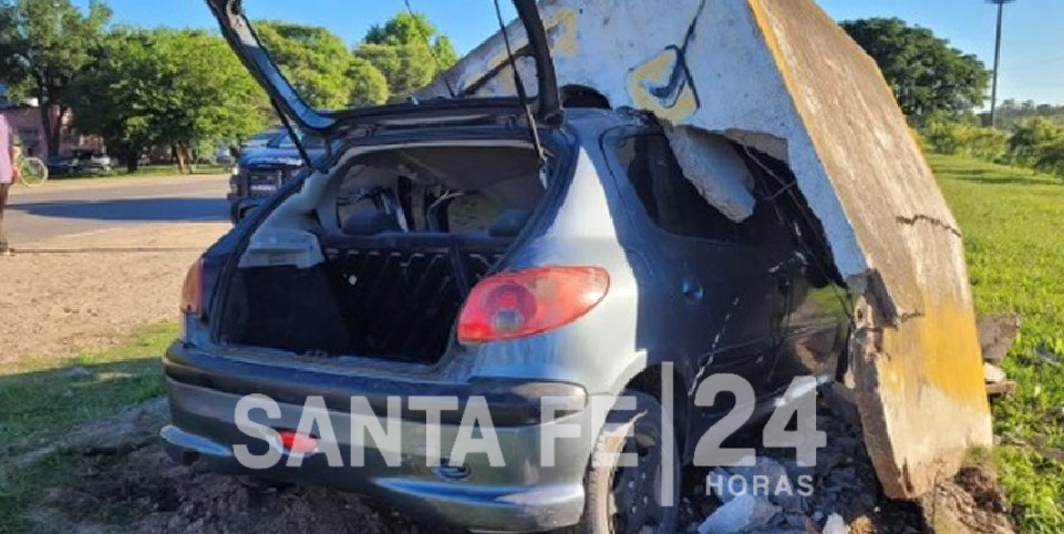 Un accidente en San Javier dejó como saldo una impactante postal luego de que un auto Peugeot 206 chocara de lleno contra una garita de colectivos de cemento en la intersección de Ruta 1 y avenida Presidente Perón.
