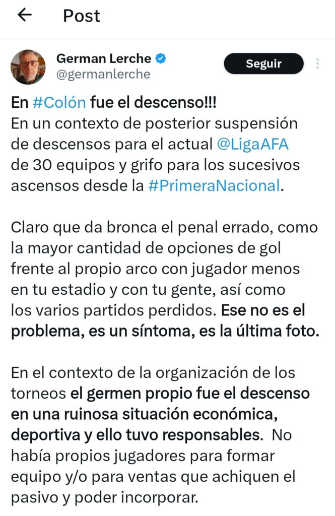 Cada vez que aparece Germán Lerche genera revuelo en el mundo Colón, ahora y luego de una nueva derrota del equipo de Yllana el ex mandatario sabalero realizó un posteo via Twitter acerca del momento deportivo que atraviesa el club del barrio Centenario.