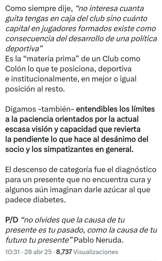 Colón: el posteo de Germán Lerche analizando el momento del club