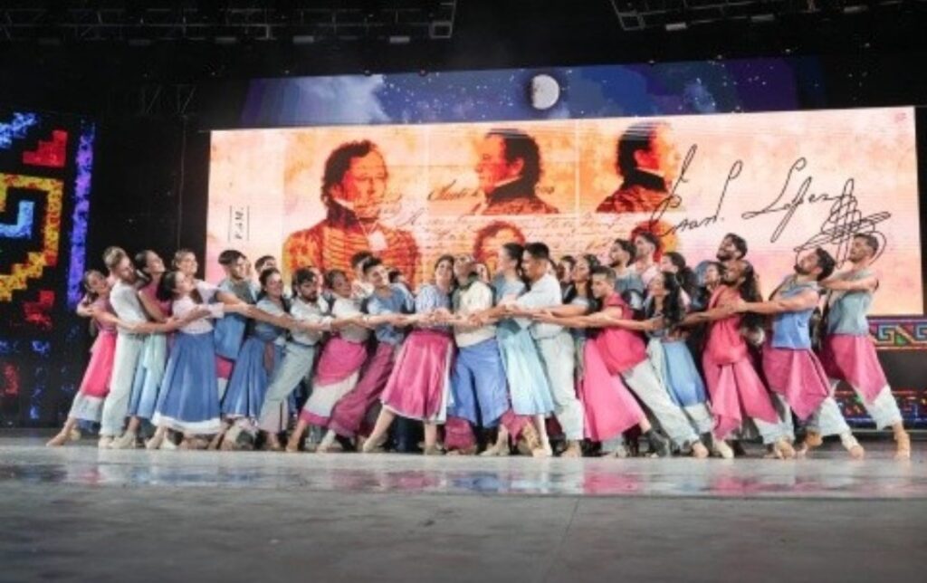 Conformada por 42 bailarinas y bailarines y un grupo musical de diez artistas, la Delegación Oficial de Santa Fe expresó en escena la diversidad cultural de la provincia, a través de distintos ritmos y danzas, con un destacado acompañamiento visual que reforzó el relato artístico del homenaje.
