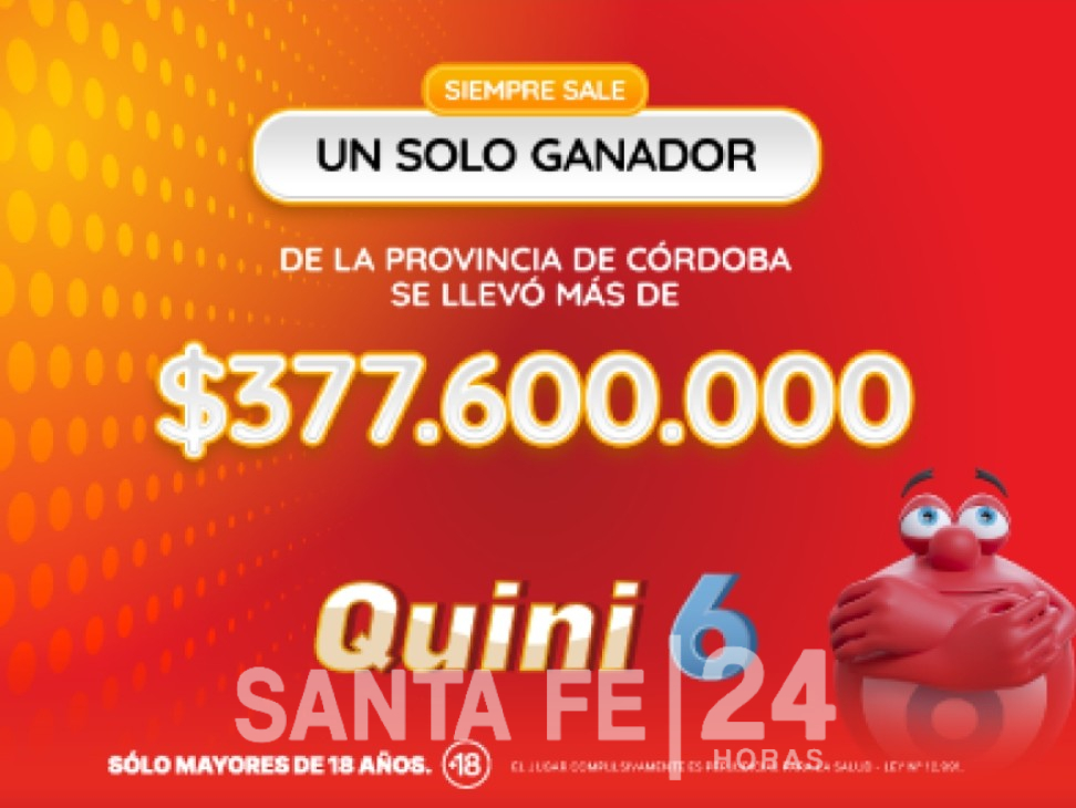 Lotería de Santa Fe informa que este domingo, finalizando el sorteo de Quini 6, un solo apostador con seis aciertos, de la localidad de Río Cuarto, provincia de Córdoba, se convirtió en el acreedor del pozo total de la modalidad «Siempre Sale» por más de $377.600.000 .