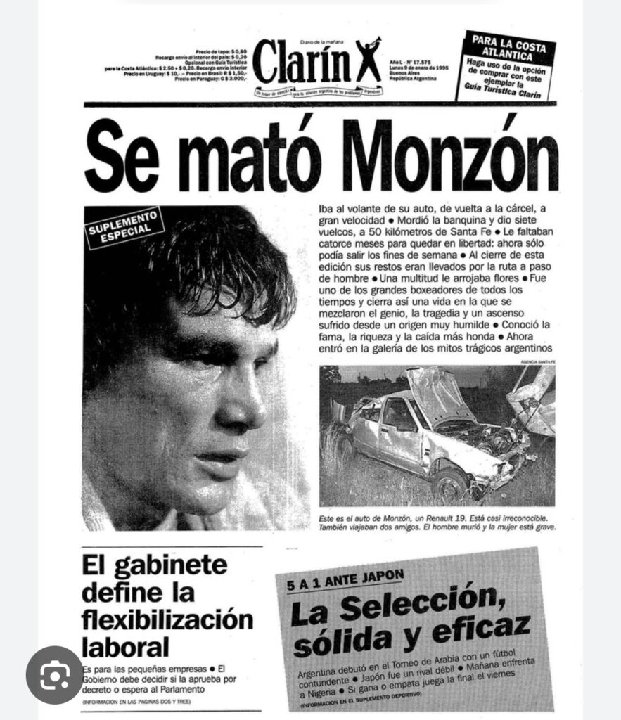 Se cumplen hoy 31 años del trágico fallecimiento de Carlos Monzón, el mejor pugilista argentino de todos los tiempos, en un fatal siniestro acontecido el domingo 8 de enero de 1995, aproximadamente a la hora 18, en la ruta provincial N° 1 «Teófilo Madrejón», a la altura del paraje Los Cerrillos, cuando contaba con 52 años de edad.