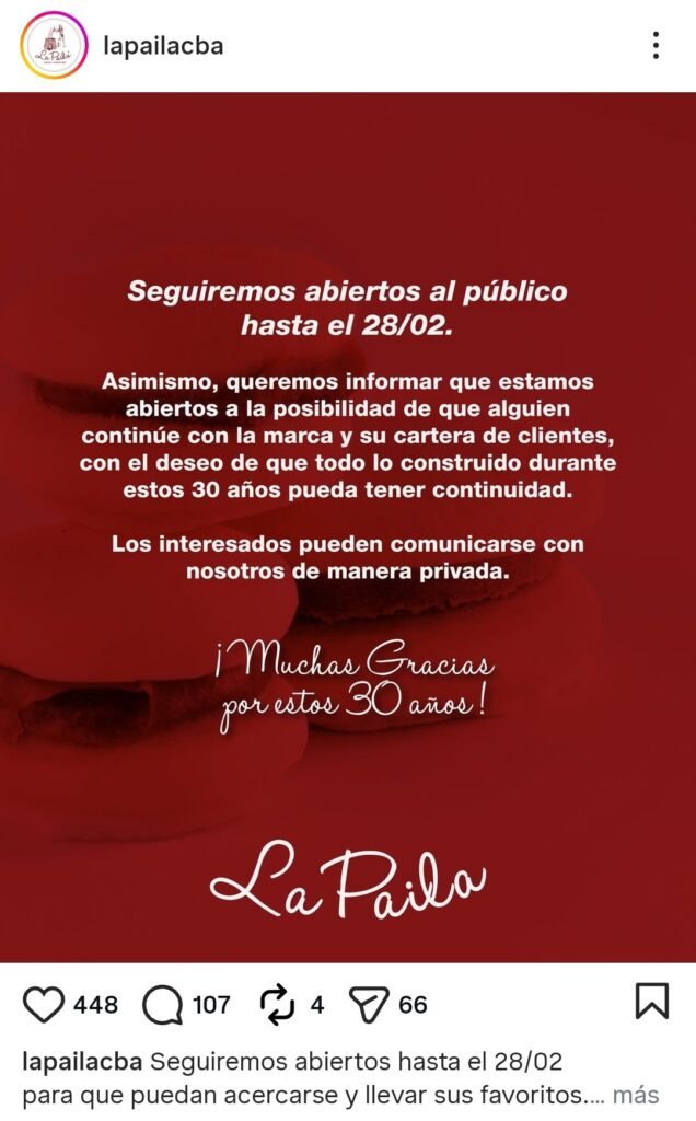 «La difícil e inestable realidad económica que vivimos en Argentina, especialmente para quienes emprenden y producen, hace cada vez más difícil sostener un proyecto en el tiempo», remarcaron desde la compañía. Y en el tramo final del mensaje agregaron: «Nos despedimos con lágrimas en los ojos y un nudo en la garganta, pero también con la tranquilidad y el orgullo de haberlo dado todo. Ojalá que algún día existan condiciones más previsibles y favorables para quienes trabajan y apuestan por este país».