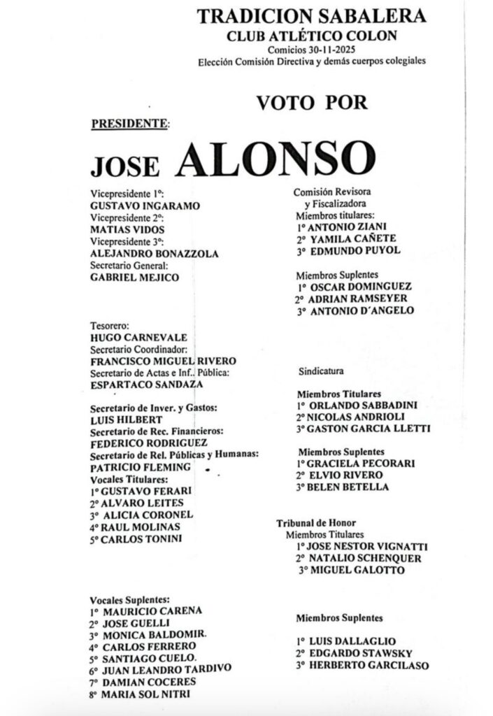De cara a los comicios del próximo 30 de noviembre, el espacio “Tradición Sabalera” presentó su lista encabezada por José Alonso, quien competirá por la presidencia del Club Atlético Colón.