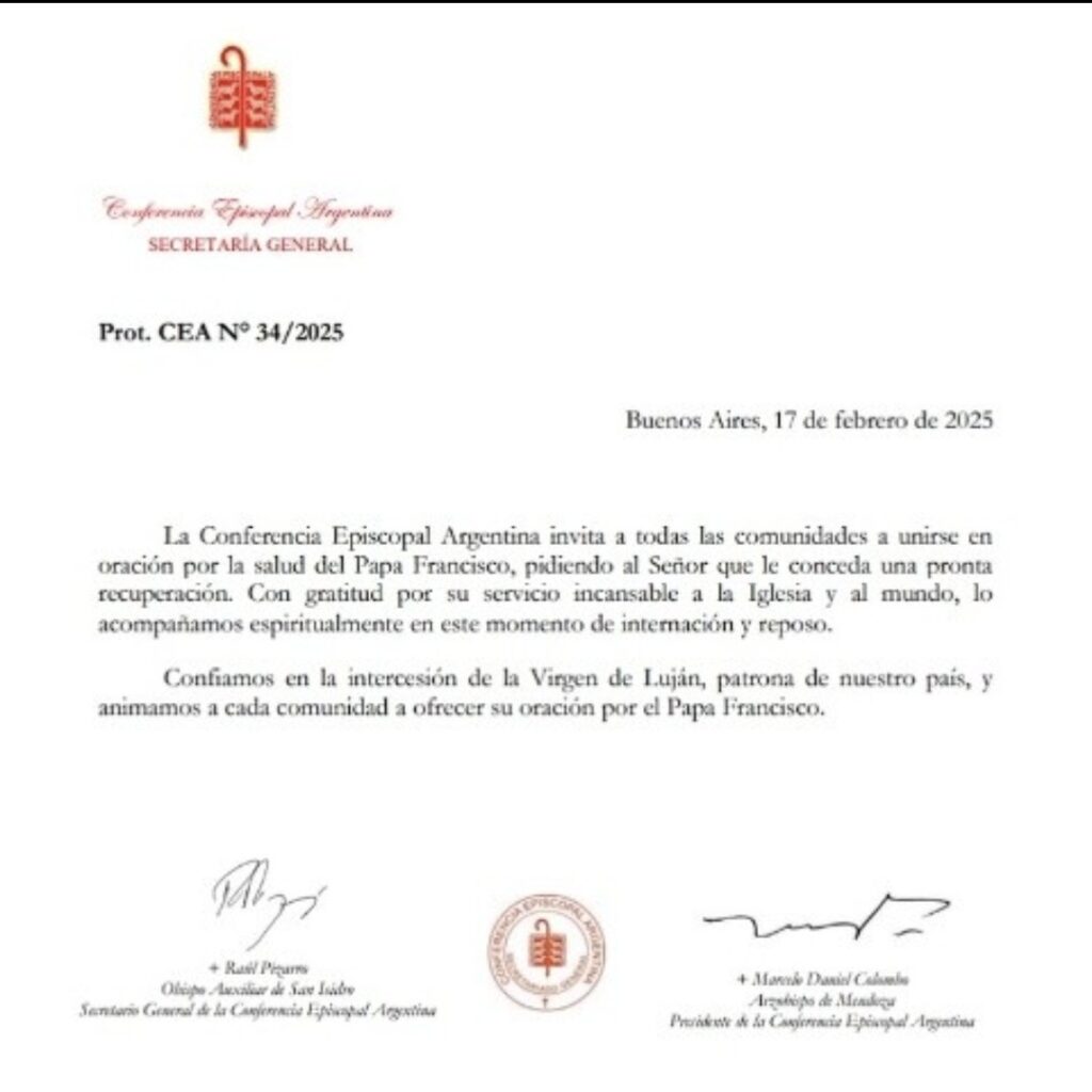 La Conferencia Episcopal Argentina (CEA) emitió un comunicado dirigido a toda la comunidad católica en el que pidió una cadena de oración por la pronta recuperación del papa Francisco, que permanece internado desde el pasado 14 de febrero por un cuadro respiratorio que en las últimas horas se tornó más «complejo».