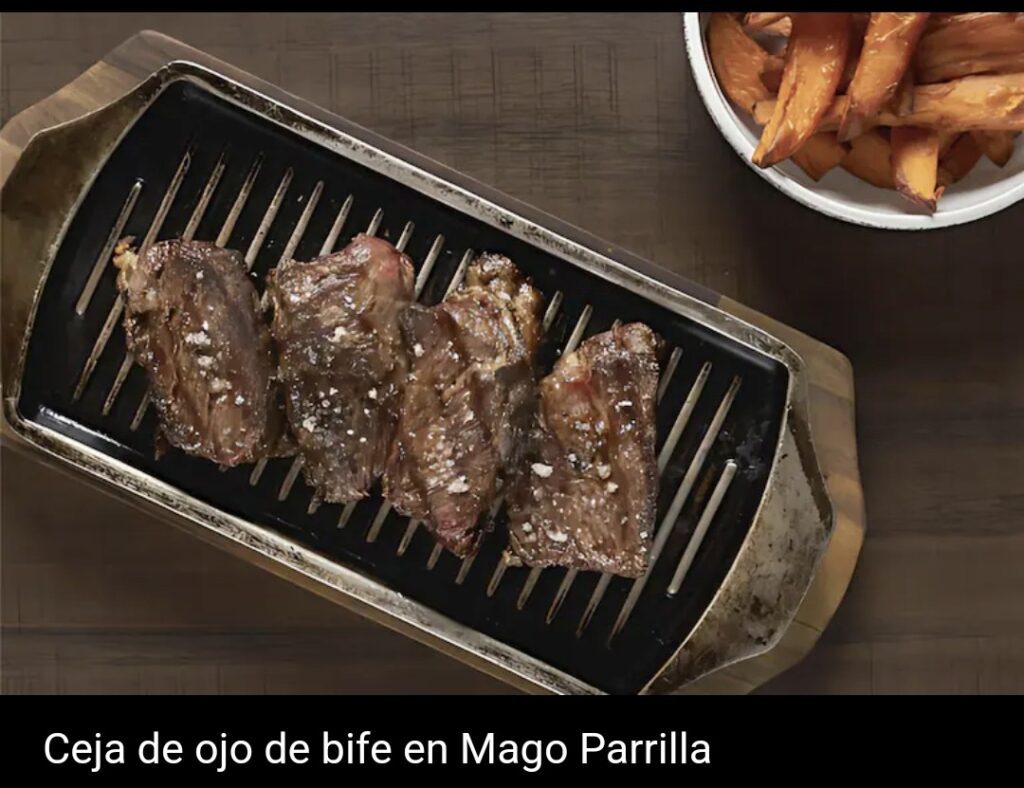 “En Mago incluimos la ceja porque nos gusta tener todas las opciones de carnes tradicionales, pero también queremos innovar con cortes poco comunes”, dice por su parte Victoria Santos de Olivera, chef de Mago Parrilla, que cuenta cómo obtienen la ceja: “La pieza de ceja la sacamos del ojo de bife: nos entra una pieza entera de aproximadamente ocho kilos y la ceja limpia queda en dos kilos. La porción que servimos es de unos 350 gramos en crudo. Es una sola pieza. Para el comensal sale en una bandeja de hierro caliente, manteniendo así la temperatura del corte”.
