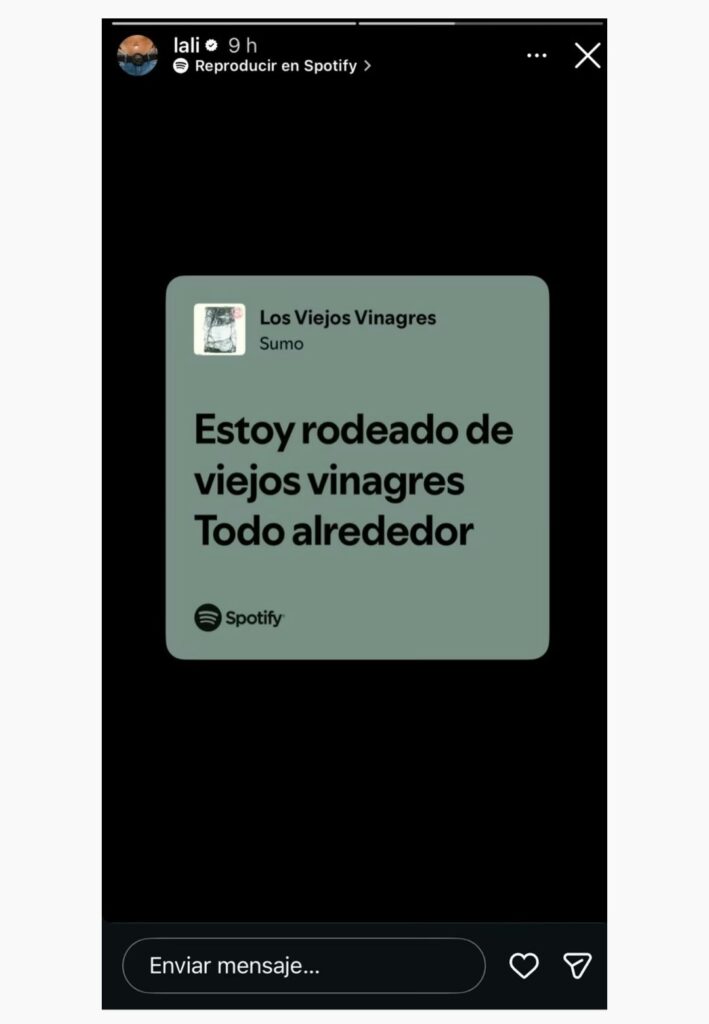 De esta manera, fiel a su estilo sutil y provocador, Lali Espósito compartió una Instagram Storie en la que puede leerse justamente parte de la estrofa de la canción Los viejos vinagres, de Sumo, que cantó ella en Cosquín Rock y que el periodista le objetó por su supuesta utilización para atacar a Javier Milei.