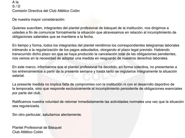 El presente de Colón en la Liga Argentina de Básquet es crítico y trasciende lo deportivo. La reciente caída frente a Villa San Martín detonó un conflicto latente: el plantel profesional decidió paralizar los entrenamientos hasta que se regularicen sus salarios. Esta medida es el resultado de un desgaste institucional que lleva meses afectando al grupo.