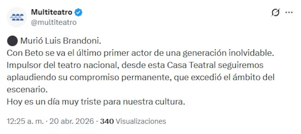 Al irse, deja una huella profunda en la cultura, el gremialismo y la vida pública del país. La triste noticia la confirmó Carlos Rottemberg: “Murió Luis Brandoni. Con Beto se va el último primer actor de una generación inolvidable. Impulsor del teatro nacional, desde esta Casa Teatral seguiremos aplaudiendo su compromiso permanente, que excedió el ámbito del escenario. Hoy es un día muy triste para nuestra cultura”.