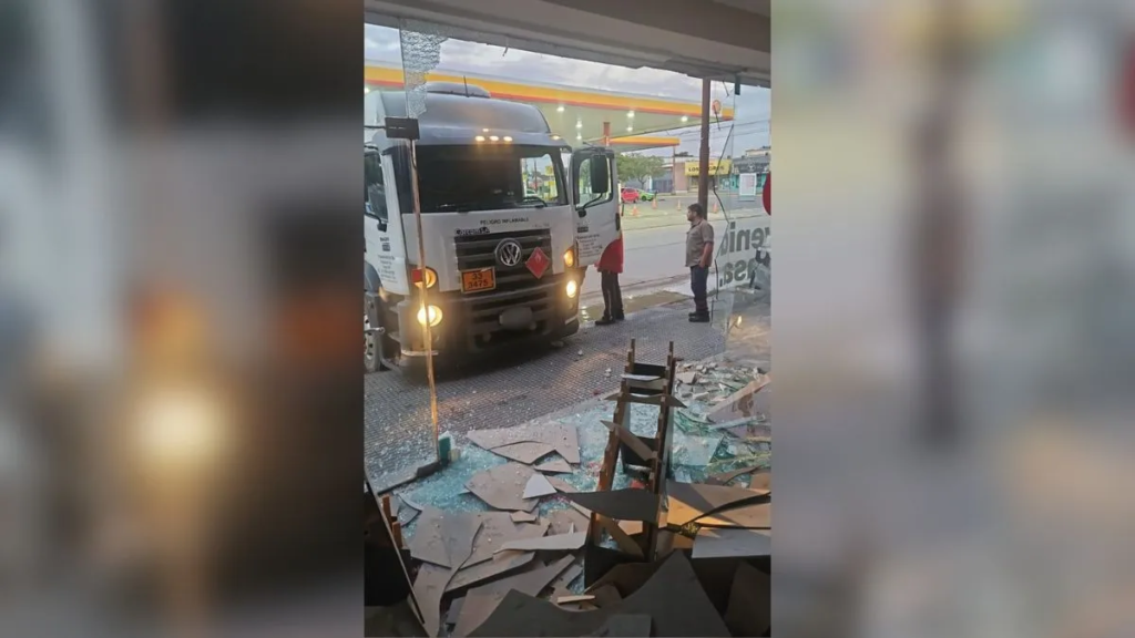 Según las primeras informaciones, el vehículo se habría quedado sin freno de mano, lo que provocó que avanzara sin control desde la estación de servicio, atravesara la calle y colisionara de lleno contra la vidriera de un reconocido local de venta de revestimientos y sillas.
