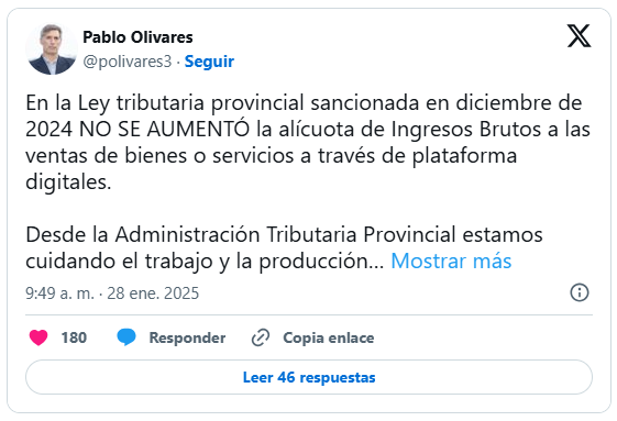 El ministro de Economía de Santa Fe, Pablo Olivares, usó sus redes sociales para responder al pedido que realizaron desde el sector fintech. Sobre las operaciones de comercio electrónico, Olivares señaló que, “en la Ley Tributaria Provincial sancionada en diciembre de 2024 NO SE AUMENTÓ la alícuota de Ingresos Brutos a las ventas de bienes o servicios a través de plataforma digitales”.