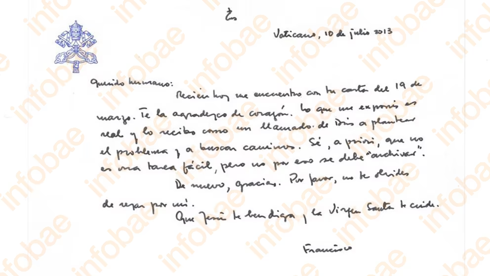 La respuesta de Francisco llegó un par de meses después. «Lo que exponés es real y lo recibo como un llamado de Dios a plantaer el problema y a buscar caminos», le contestó