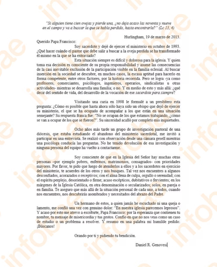 —Sí, en marzo de 2013. Una semana después de que asumió me salió escribirle. Muchas veces había estado en contacto con personas que habían dejado de ser sacerdotes católicos y los vi sufrir. Y esa carta expresaba el dolor de muchos. Básicamente decía: “¿Qué va a hacer con aquellos que han dejado de ser sacerdotes? Parecemos leprosos”. Meses más tarde me respondió y después publiqué ese intercambio en un libro que se llama Querido hermano. Fue algo simbólico, pero importante: al menos hubo una respuesta. El Papa empezaba diciendo: “Lo que exponés es real y lo recibo como un llamado de Dios a plantear el problema y buscar caminos”.