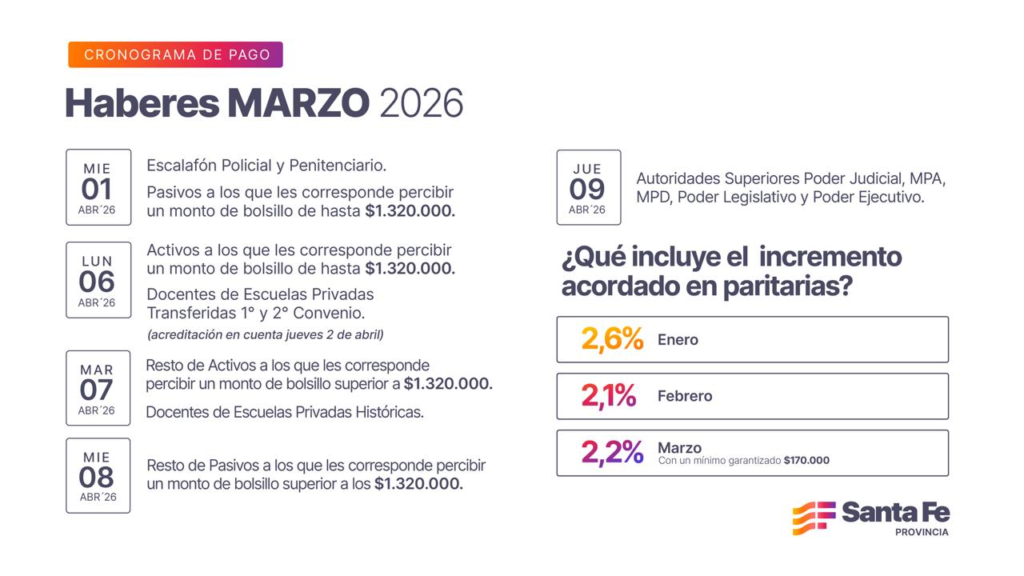 El Gobierno Provincial, a través del Ministerio de Economía, informó que el cronograma del pago de haberes del mes de marzo se percibirá a partir del miércoles 1 de abril y concluirá el jueves 9.