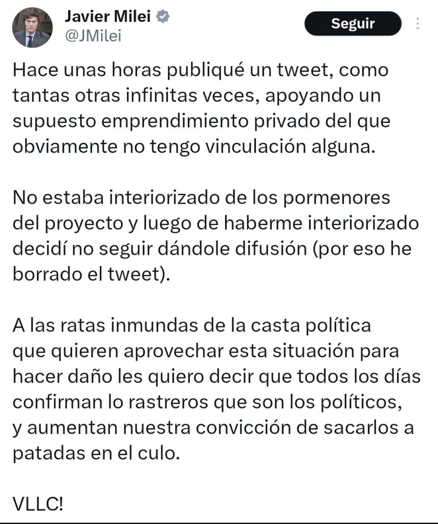 “Como custodio—y no propietario—de estos fondos, no me siento cómodo transfiriéndolos a los asociados de Milei ni al equipo de KIP. En cambio, después de consultar con expertos, propongo reinvertir el 100% de los fondos bajo mi control, hasta $100 millones, de nuevo en Libra Token y quemar todos los tokens comprados. A menos que se presente una alternativa más viable, tengo la intención de comenzar a ejecutar este plan dentro de las próximas 48 horas», explicó. Y concluyó sosteniendo que su compromiso “con la transparencia y continuaré proporcionando actualizaciones a medida que se desarrolle la situación”.