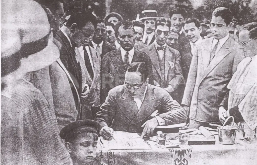 El presidente de Unión Francisco Anello firma el acta del día que se colocó la piedra fundamental del estadio de la Avenida López y Planes